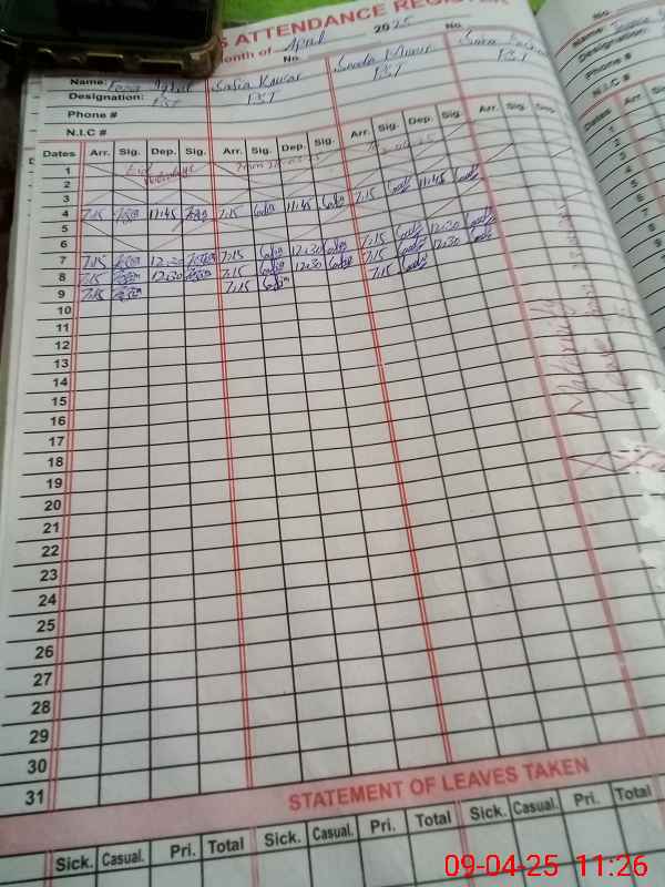 | CNIC | Full Name | Designation | R/C | Absence During Last Calender Month |