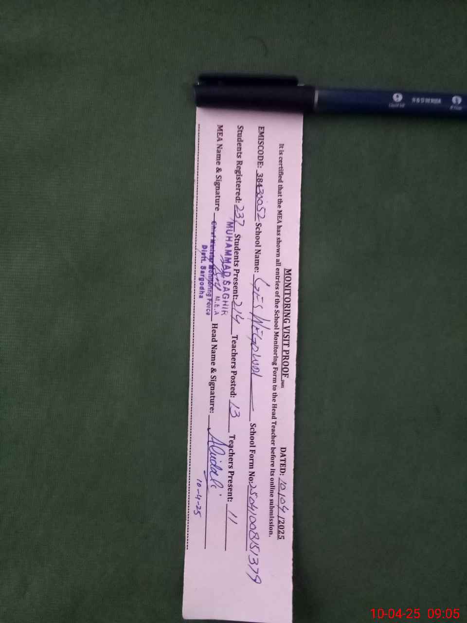 | Certified that this School was Inspected by the Undersigned MEA/DMO Today and the Information Stated Above is as Per Record. | |||||