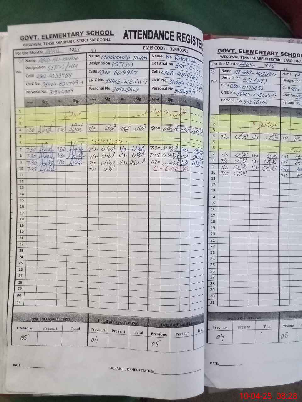 | CNIC | Full Name | Designation | R/C | Absence During Last Calender Month |