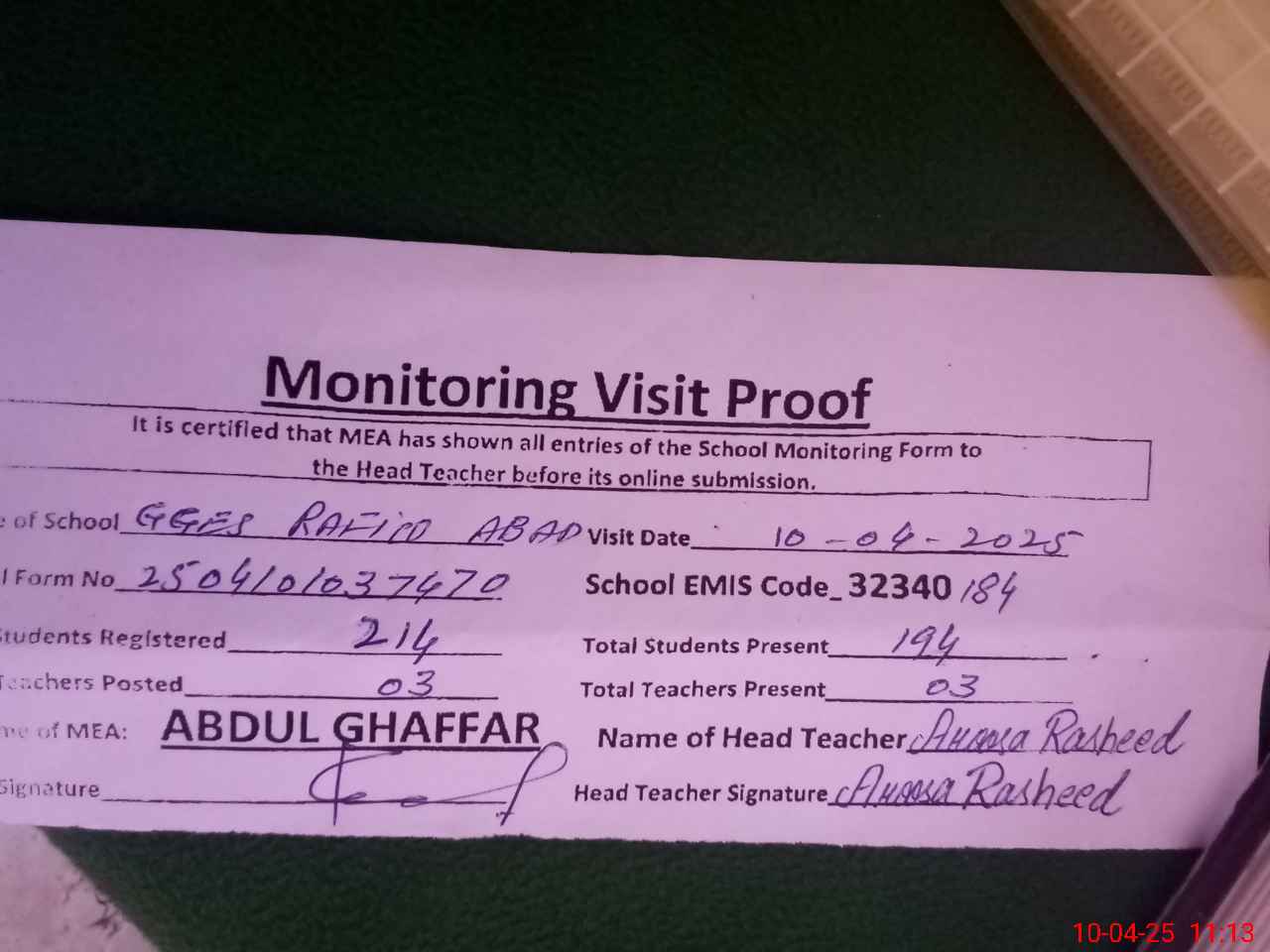 | Monitoring Date: 10-04-2025 | Start Time: 10-04-2025 10:37 AM | End Time: 10-04-2025 11:16 AM | Name of MEA: Ab**** Gh**** | |