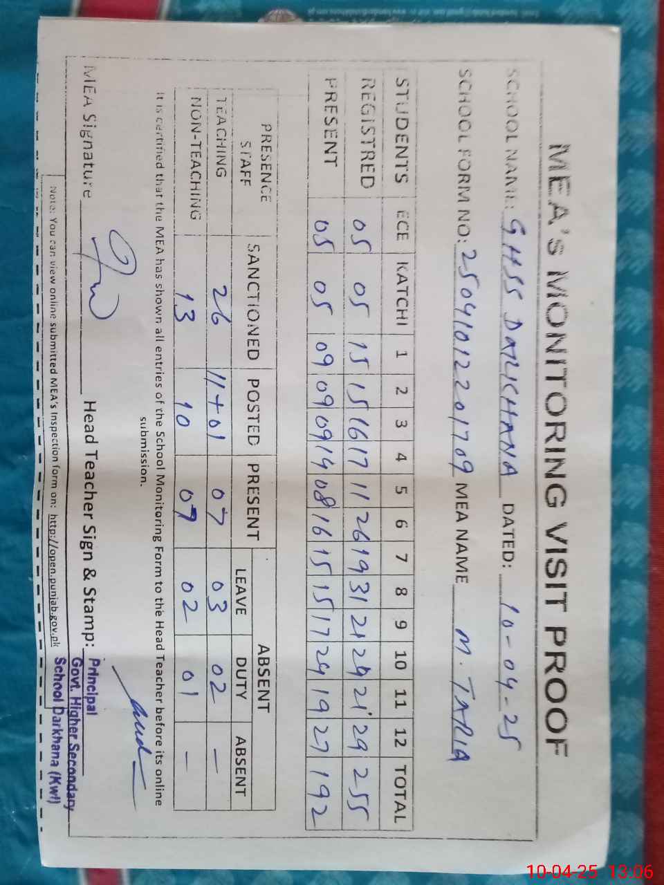| Attendance Register | Head Teacher | MEA with School | Visit Proof |