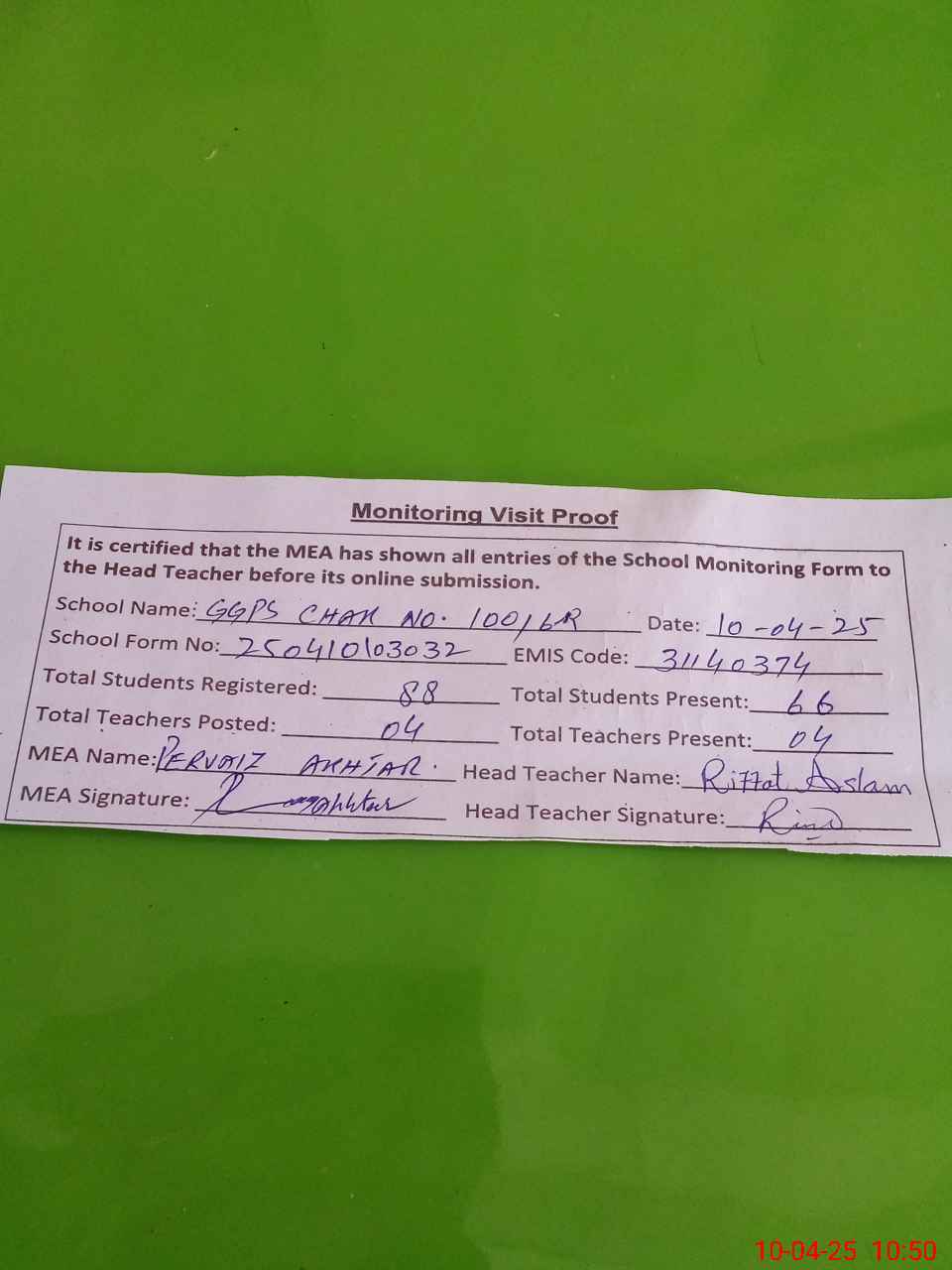 | Attendance Register | Head Teacher | MEA with School | Visit Proof |