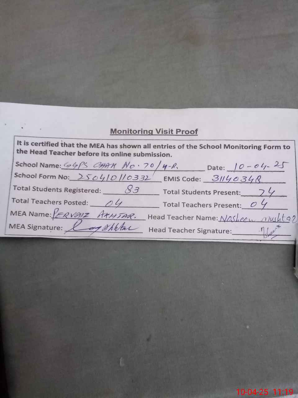 | EMIS Code: 31140348 | Name of School: GGPS CHAK NO 70/4-R | |||