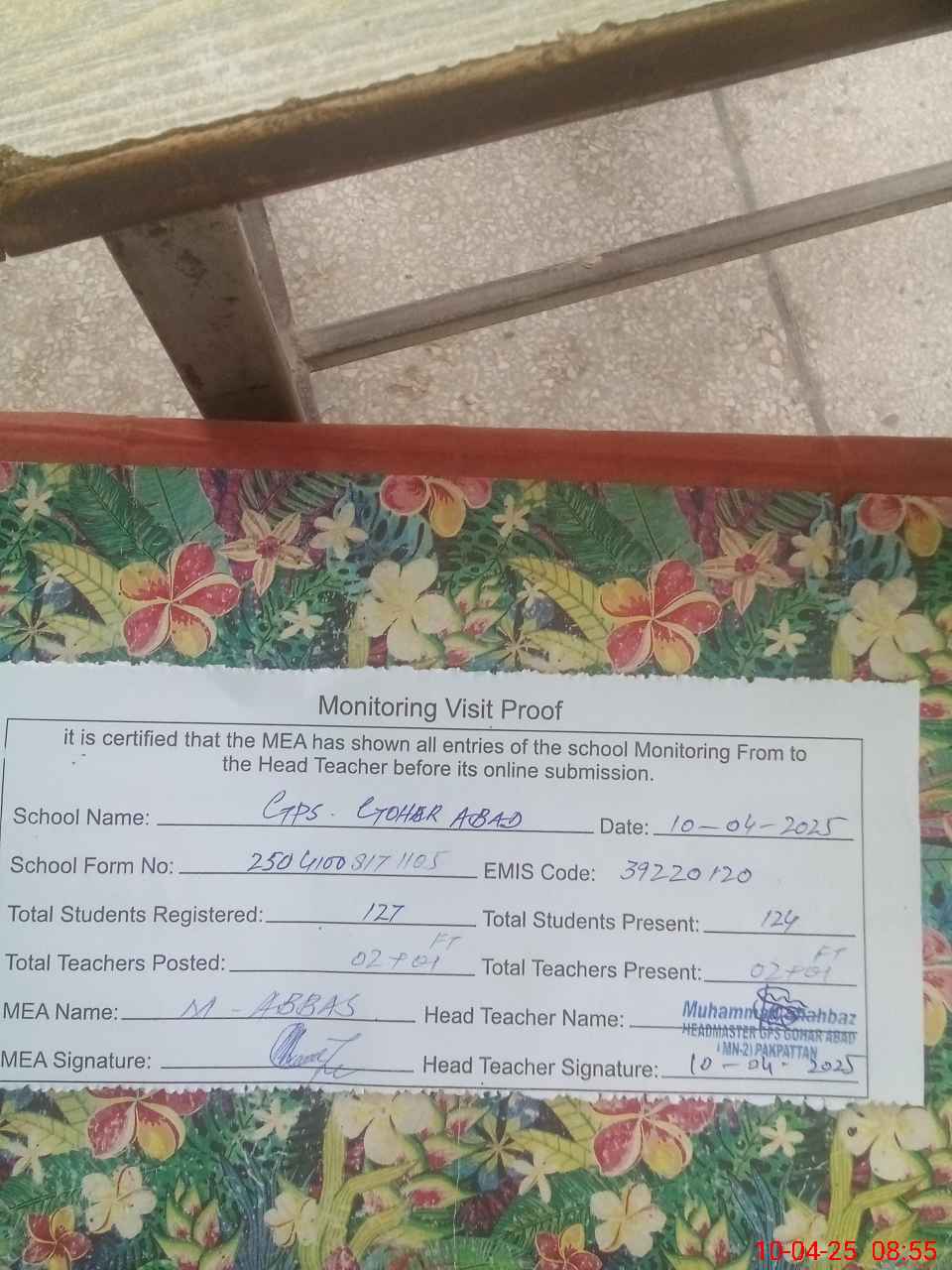 | Attendance Register | Head Teacher | MEA with School | Visit Proof |