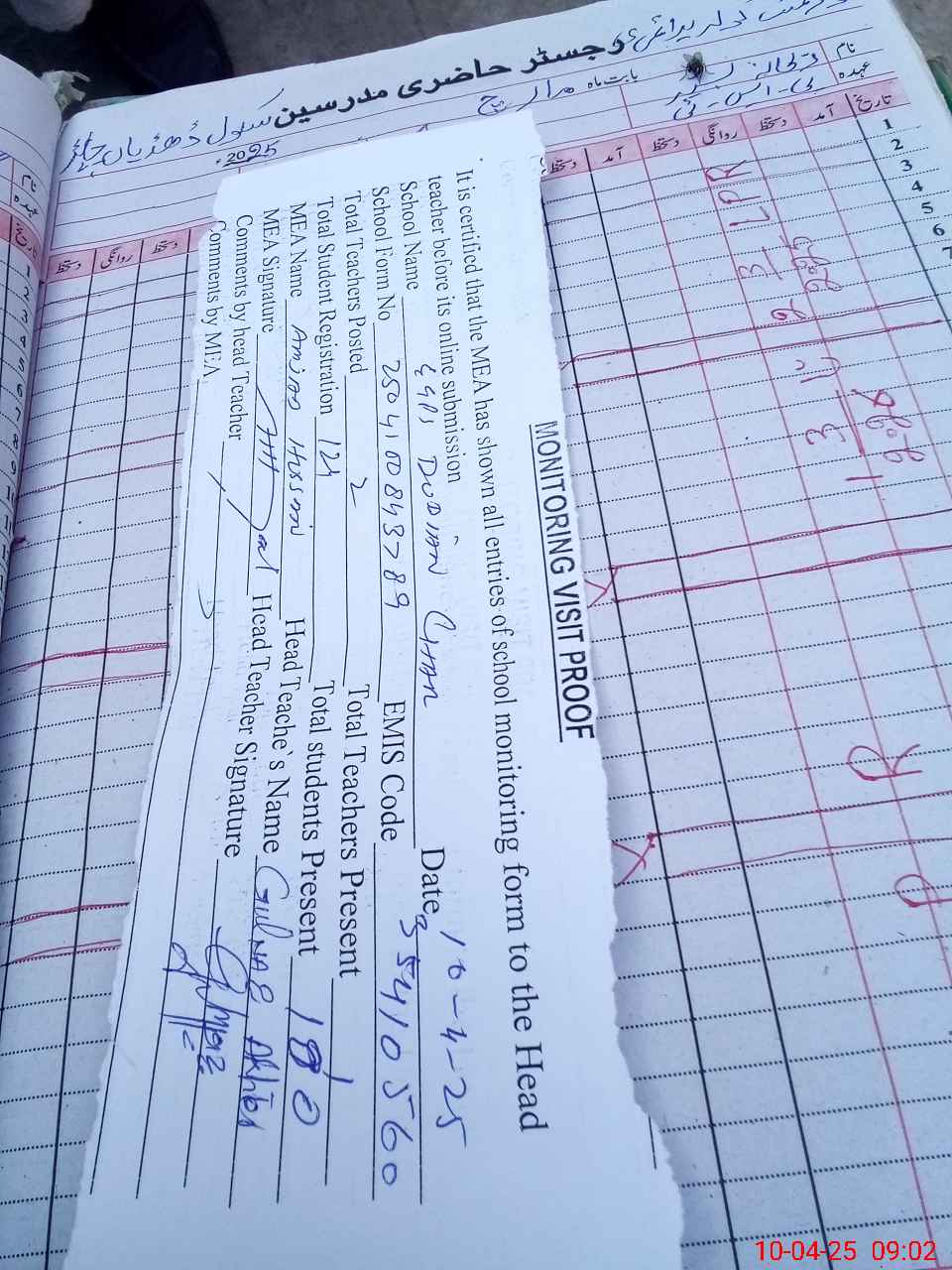 | Attendance Register | Head Teacher | MEA with School | Visit Proof |
