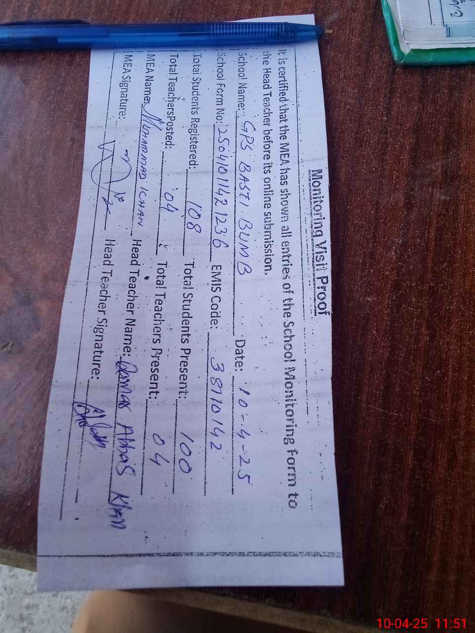 | Attendance Register | Head Teacher | MEA with School | Visit Proof |