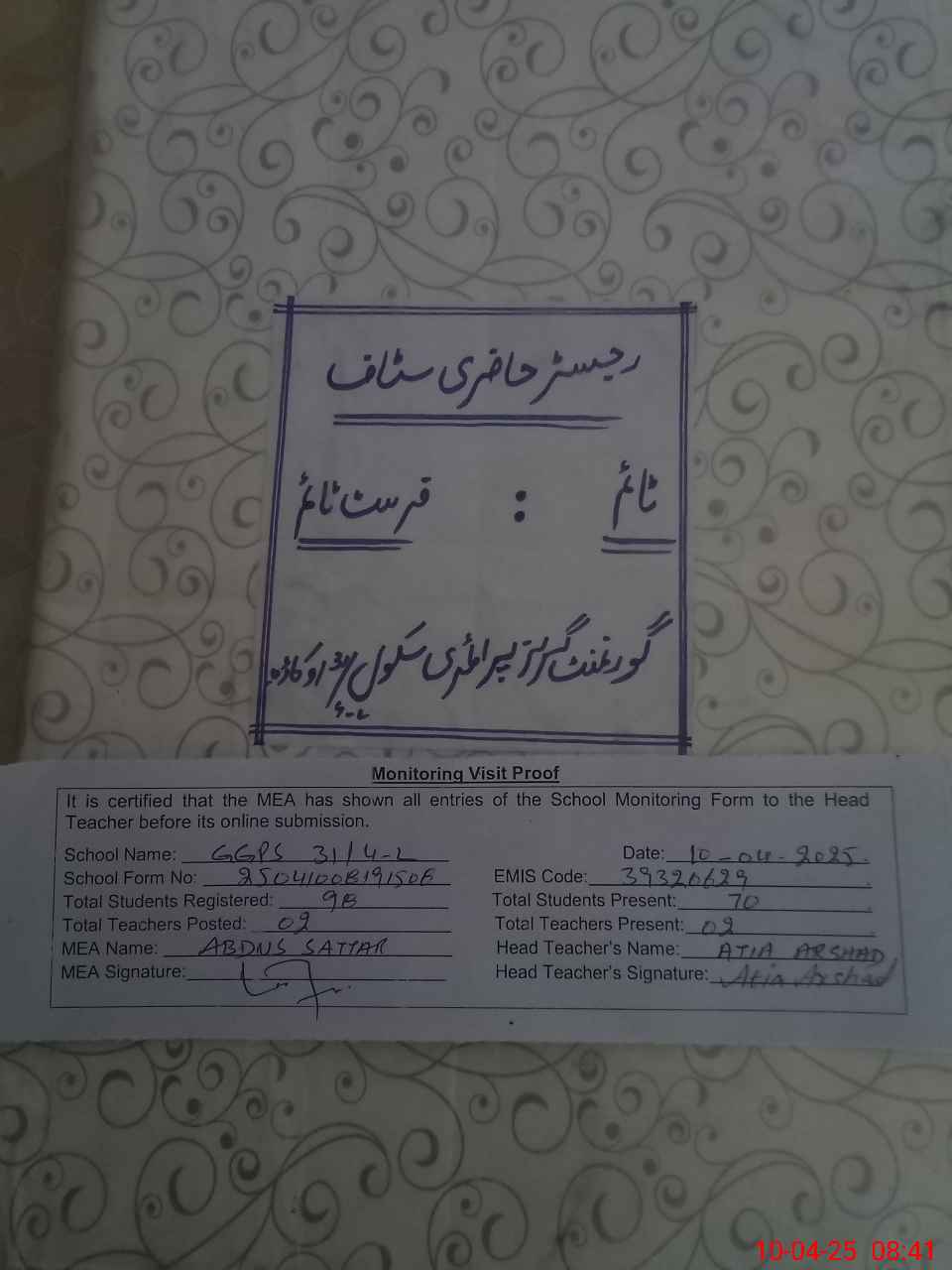| Attendance Register | Head Teacher | MEA with School | Visit Proof |