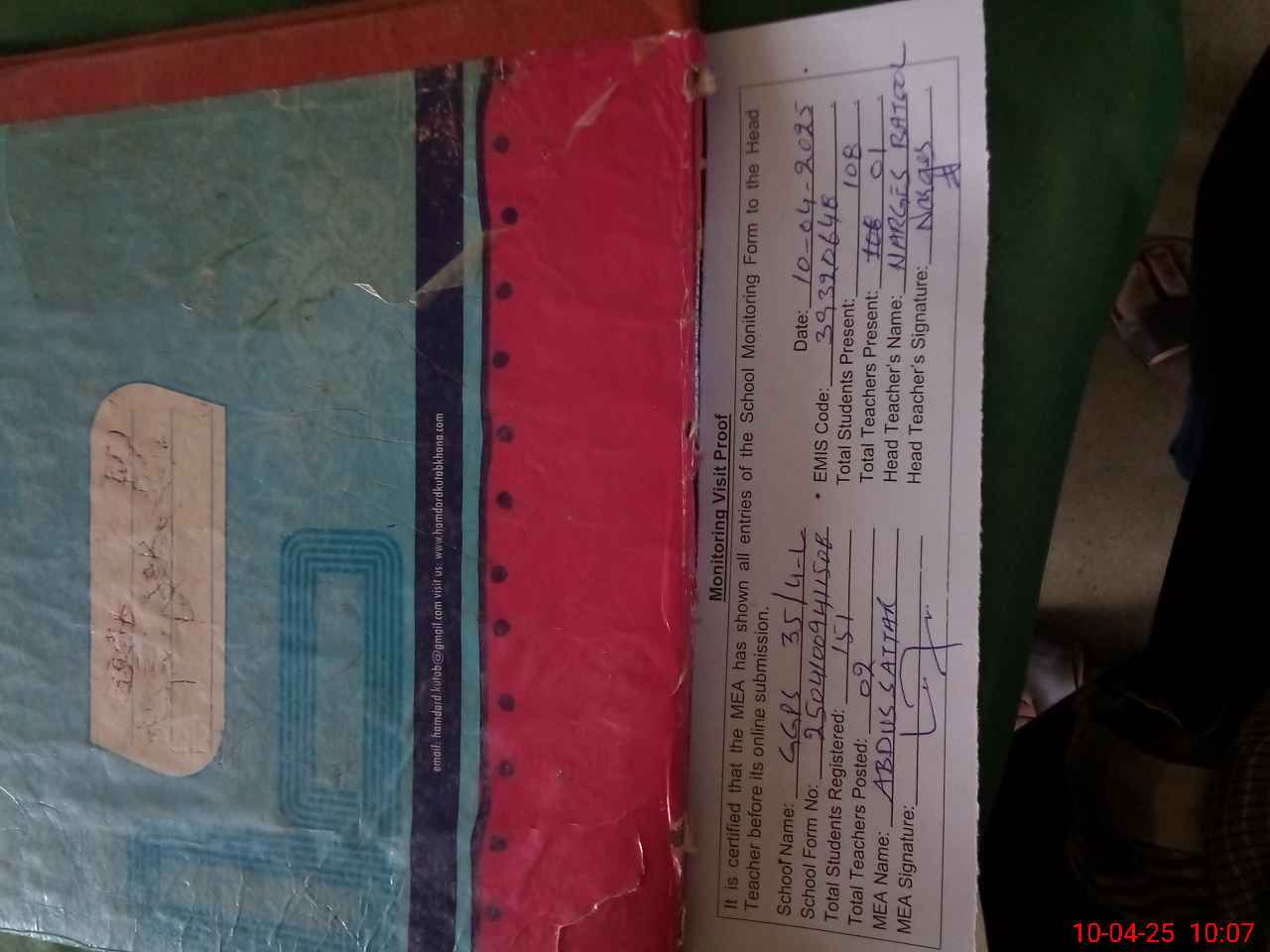 | Attendance Register | Head Teacher | MEA with School | Visit Proof |