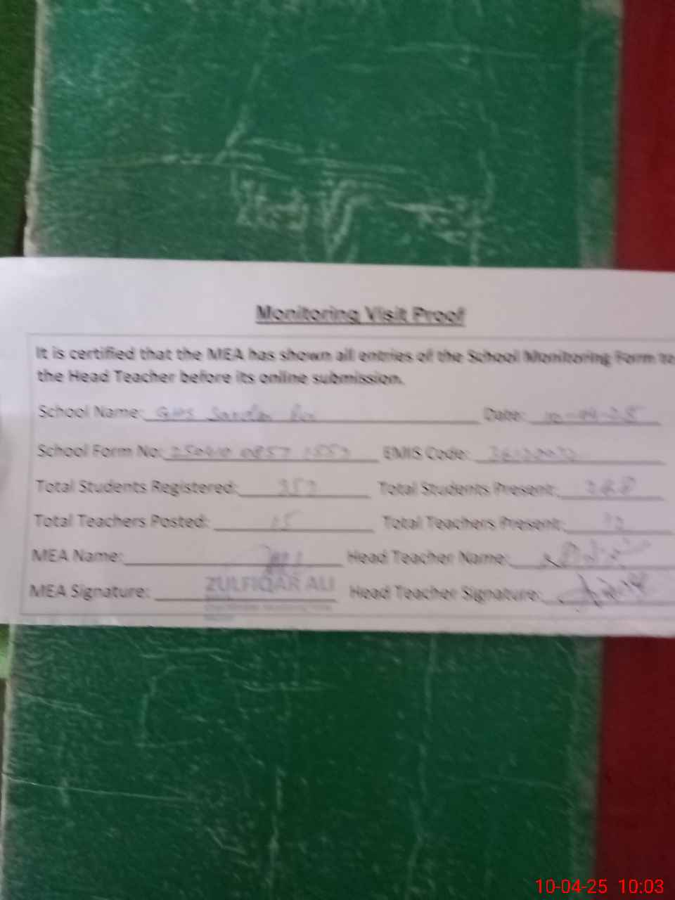 | Monitoring Date: 10-04-2025 | Start Time: 10-04-2025 08:57 AM | End Time: 10-04-2025 10:04 AM | Name of MEA: Zu**** Al**** | |