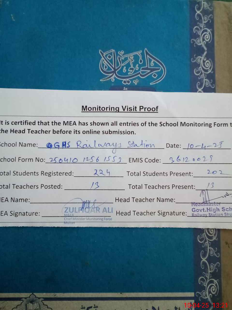 | Attendance Register | Head Teacher | MEA with School | Visit Proof |