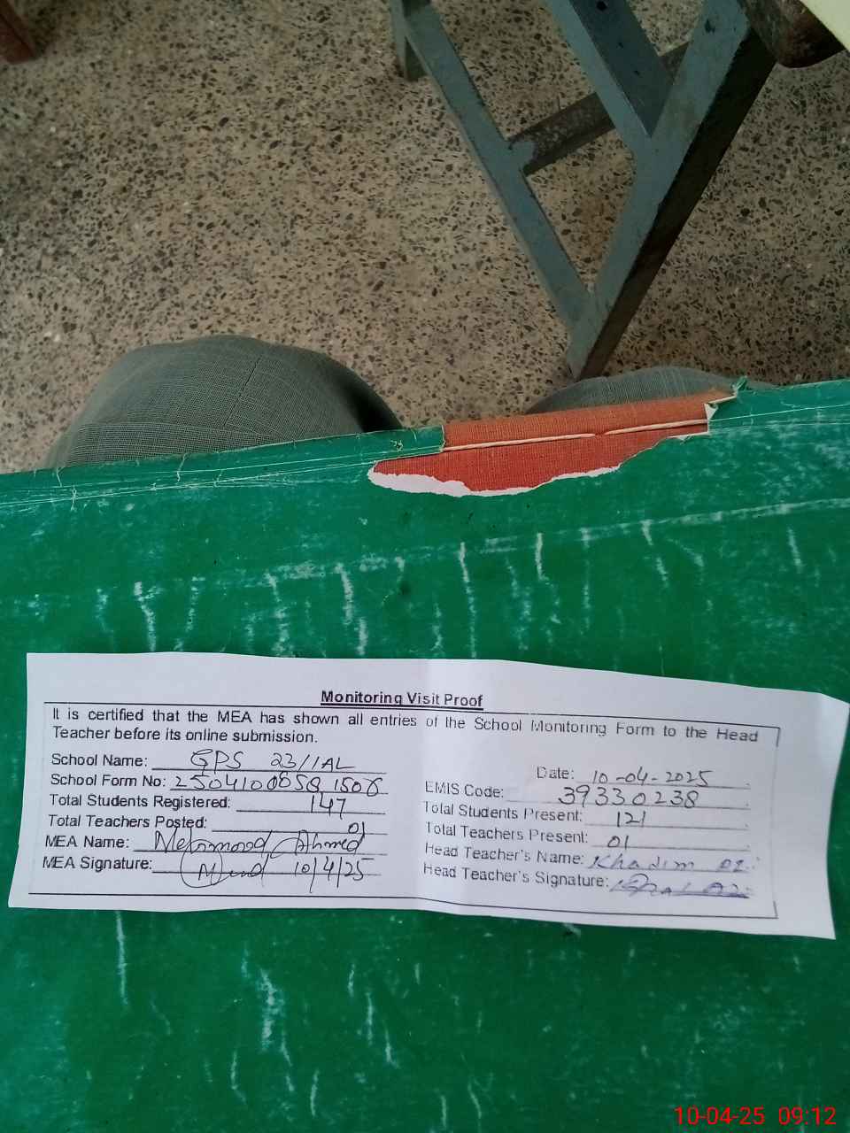 | EMIS Code: 39330238 | Name of School: GPS CHAK NO. 23/1-AL | |||