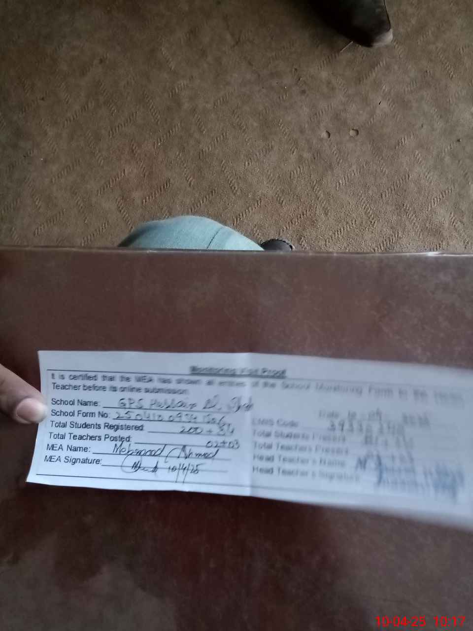 | Attendance Register | Head Teacher | MEA with School | Visit Proof |