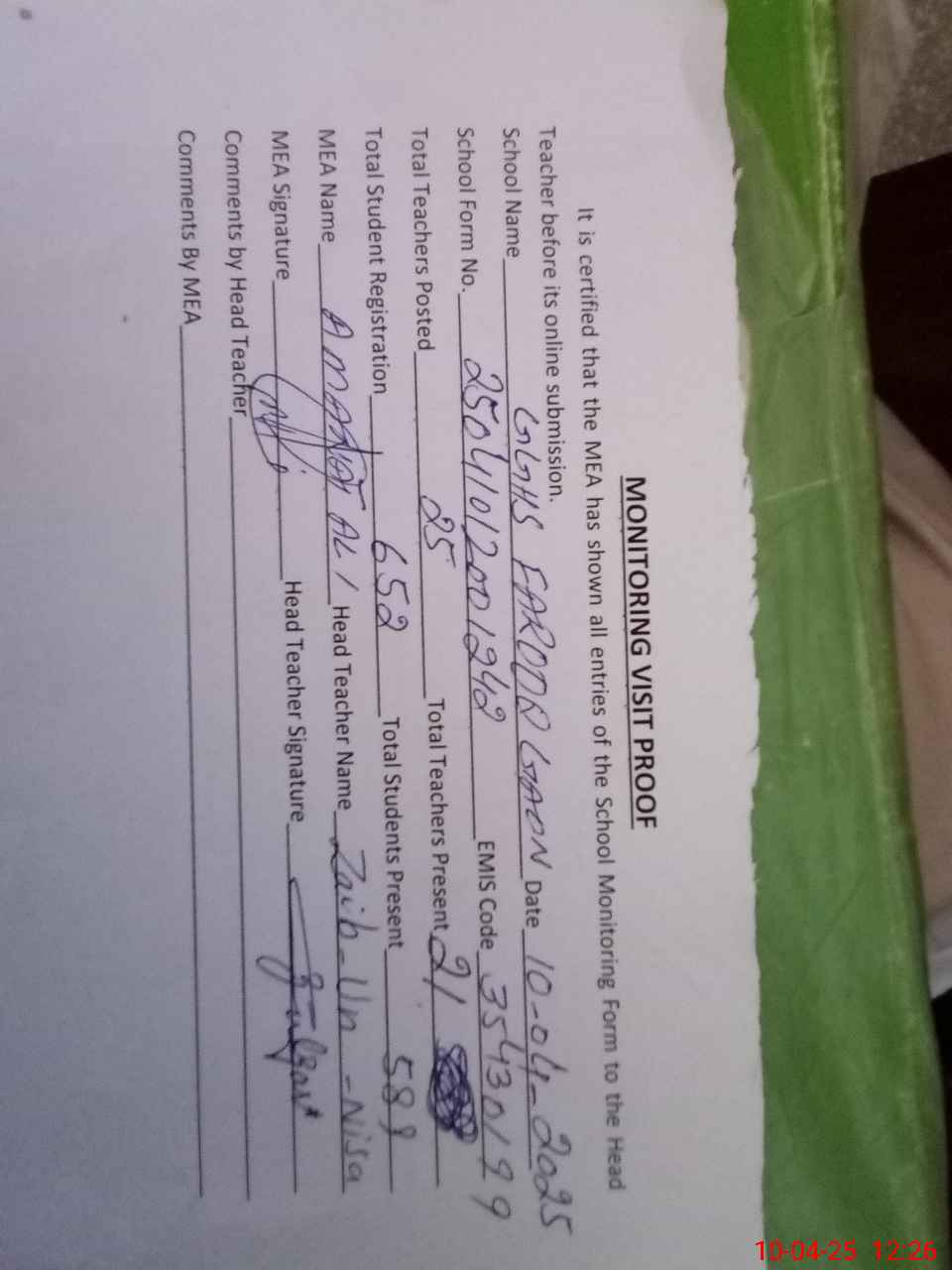 | Attendance Register | Head Teacher | MEA with School | Visit Proof |