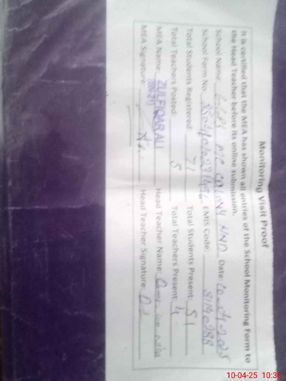 | Attendance Register | Head Teacher | MEA with School | Visit Proof |