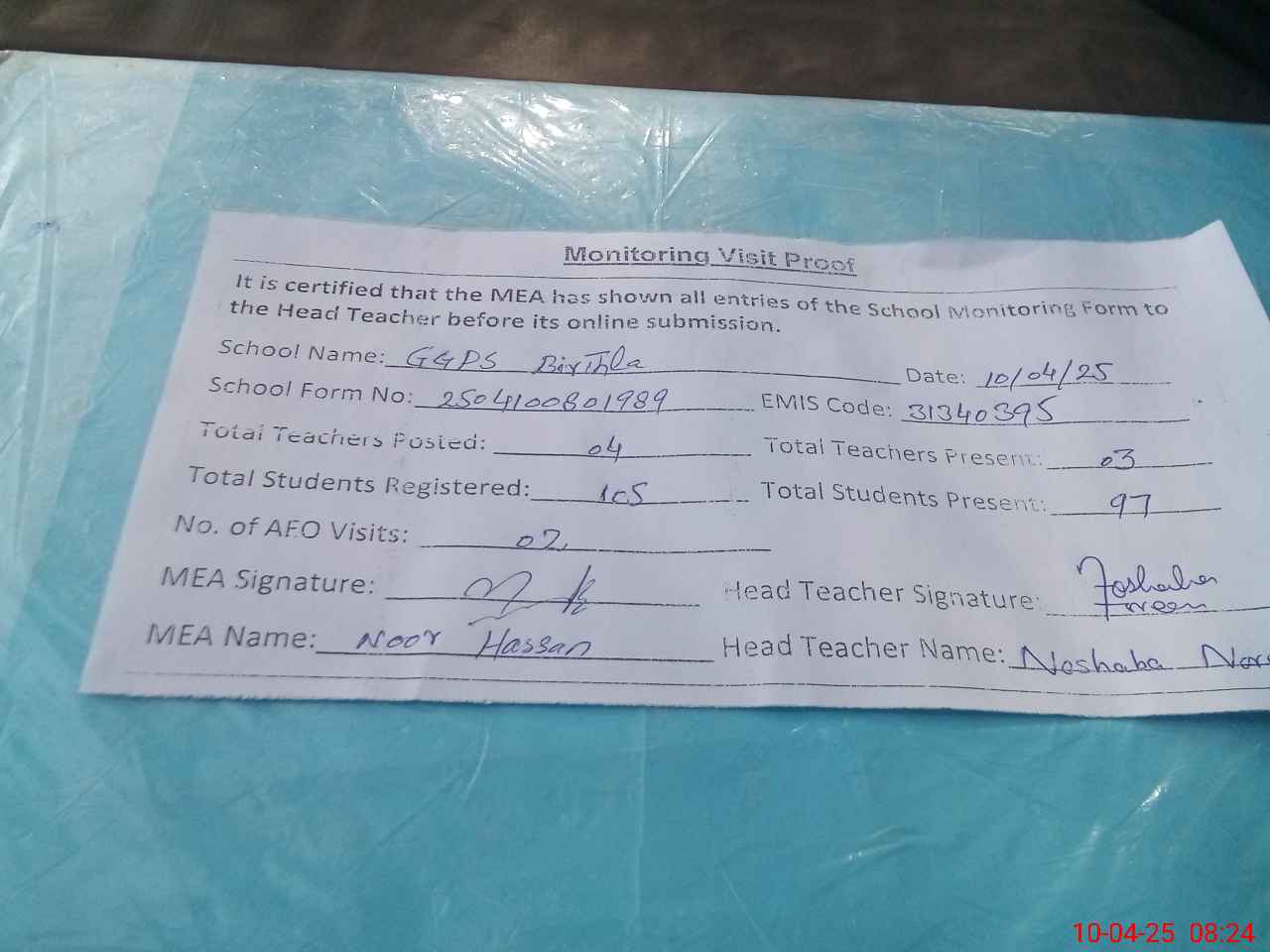 | EMIS Code: 31340395 | Name of School: GGPS BIRTHWALA | |||