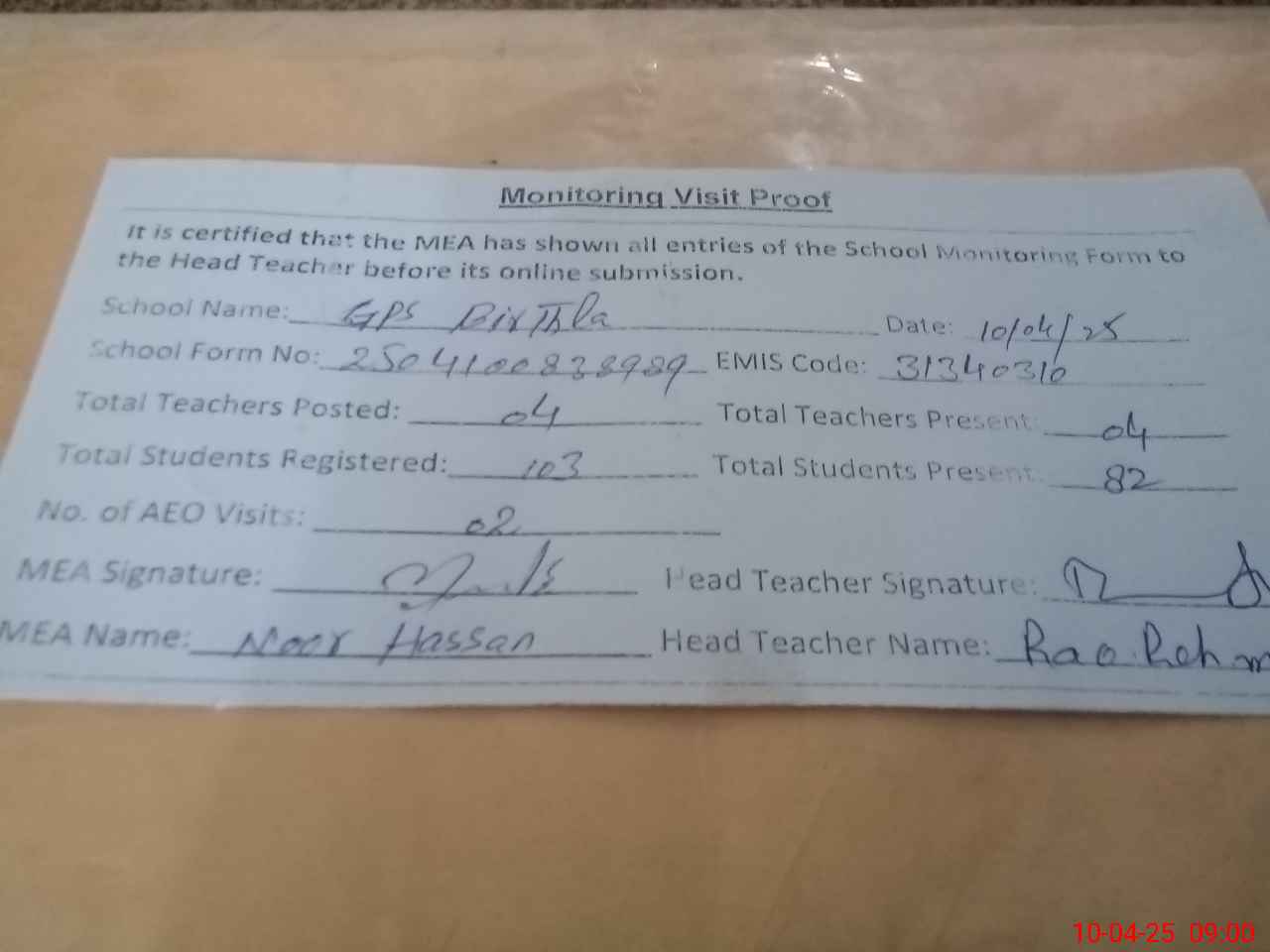 | Attendance Register | Head Teacher | MEA with School | Visit Proof |