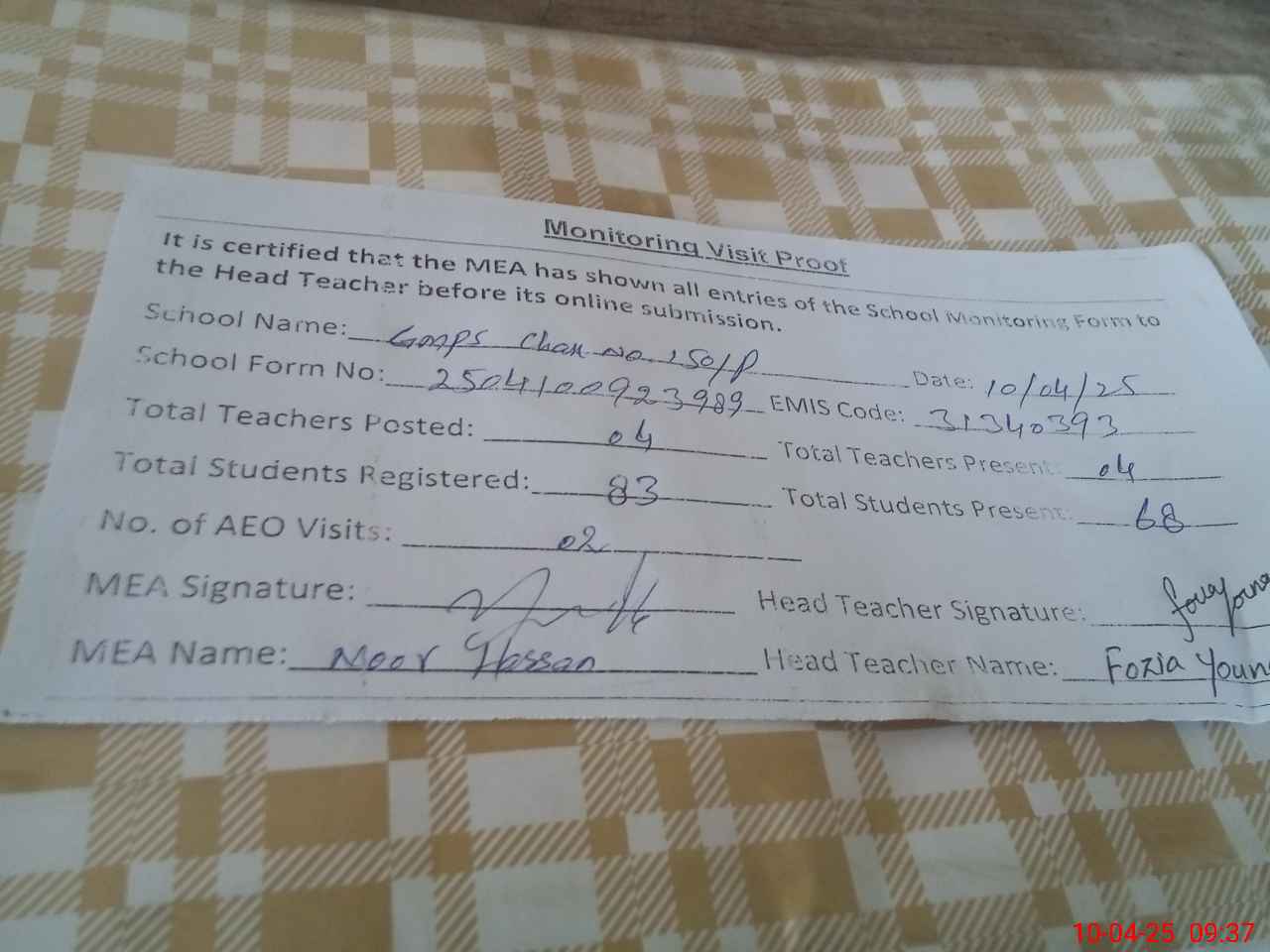 | Attendance Register | Head Teacher | MEA with School | Visit Proof |