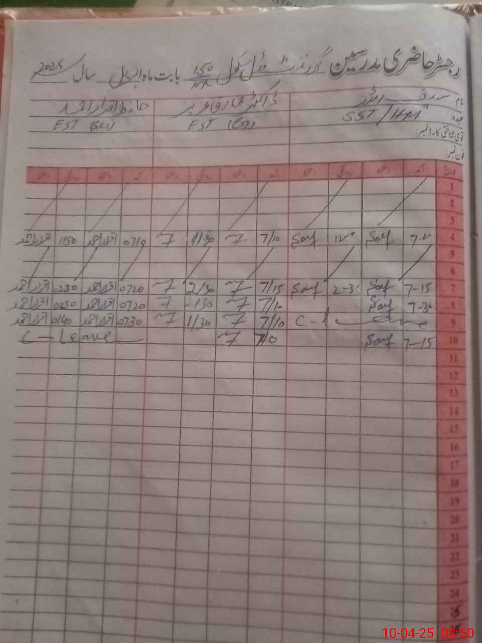 | CNIC | Full Name | Designation | R/C | Absence During Last Calender Month |