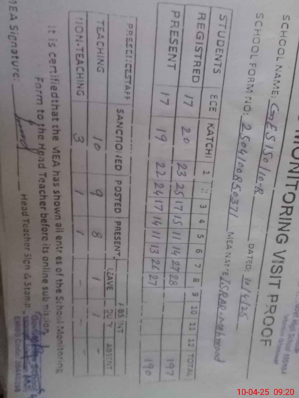 | Attendance Register | Head Teacher | MEA with School | Visit Proof |