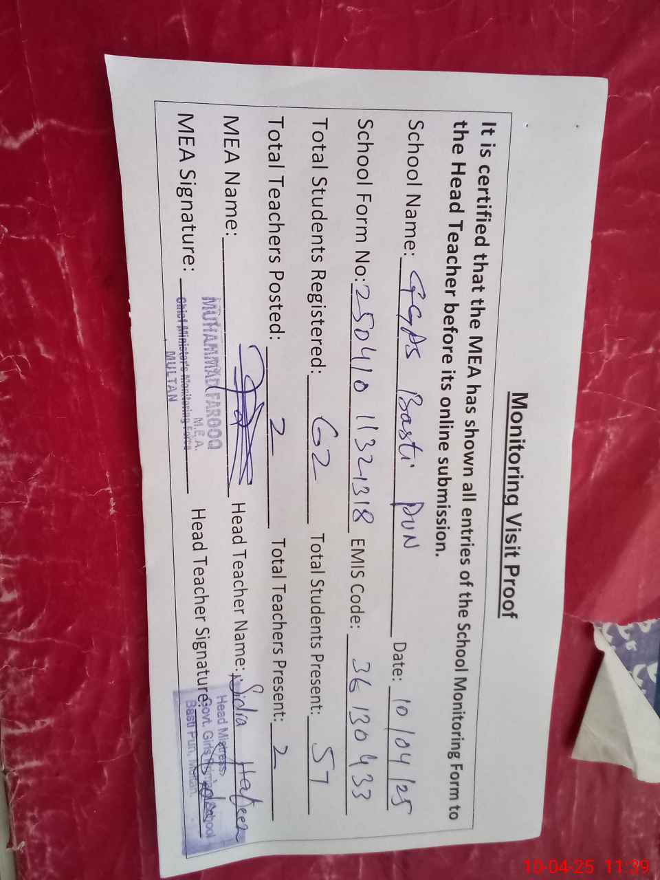 | Attendance Register | Head Teacher | MEA with School | Visit Proof |