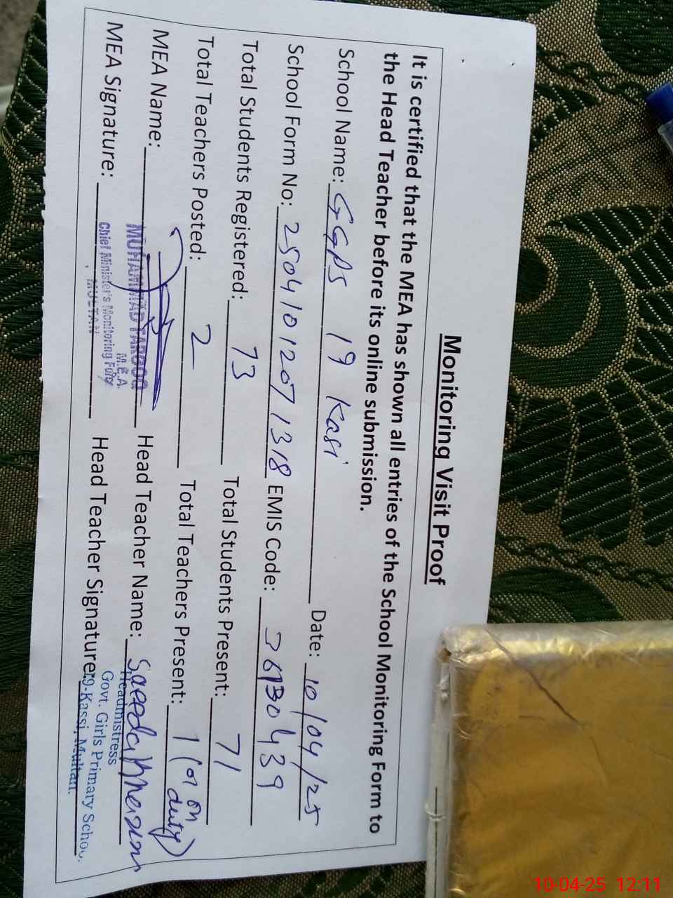 | Certified that this School was Inspected by the Undersigned MEA/DMO Today and the Information Stated Above is as Per Record. | |||||