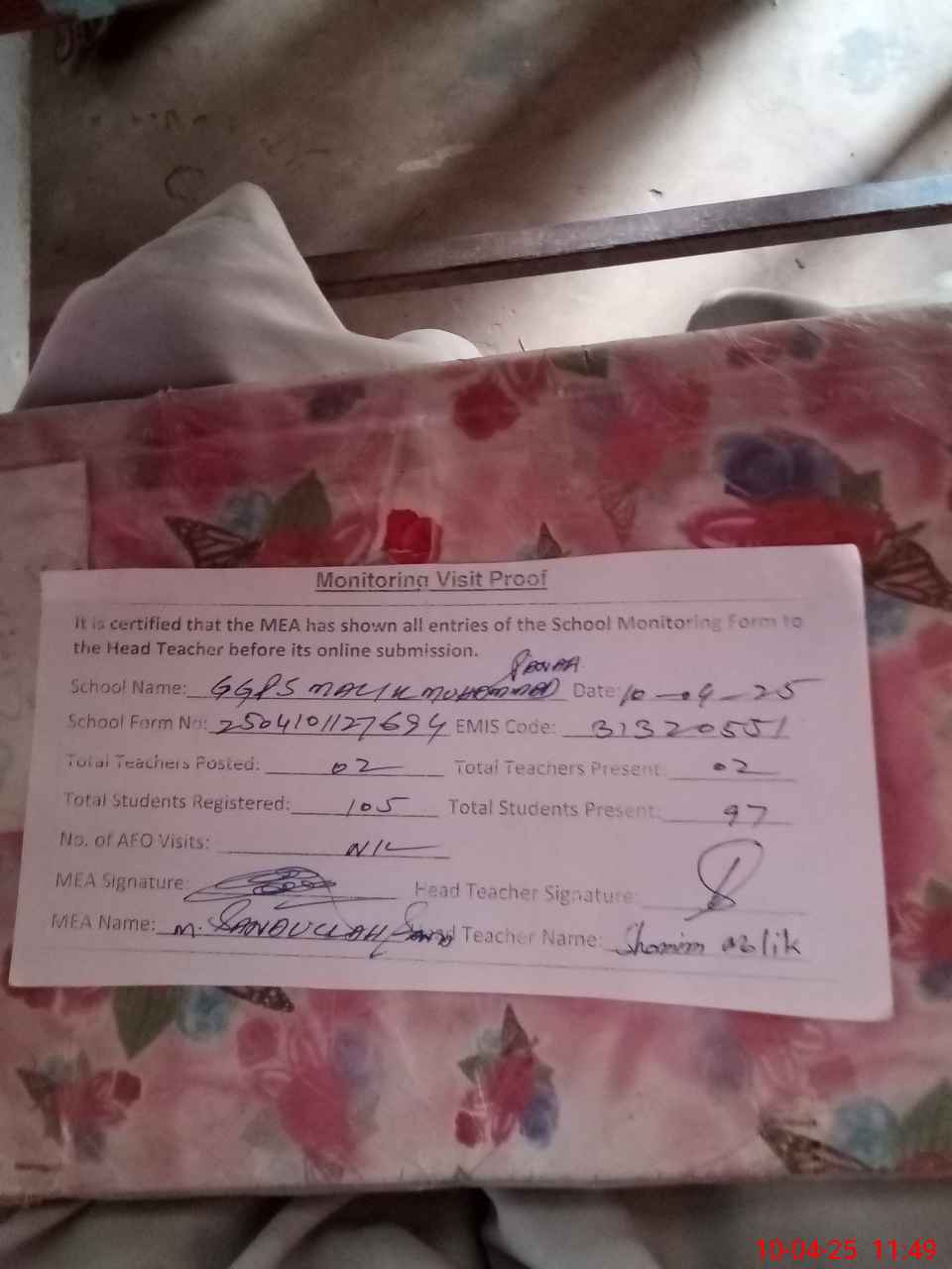 | Attendance Register | Head Teacher | MEA with School | Visit Proof |
