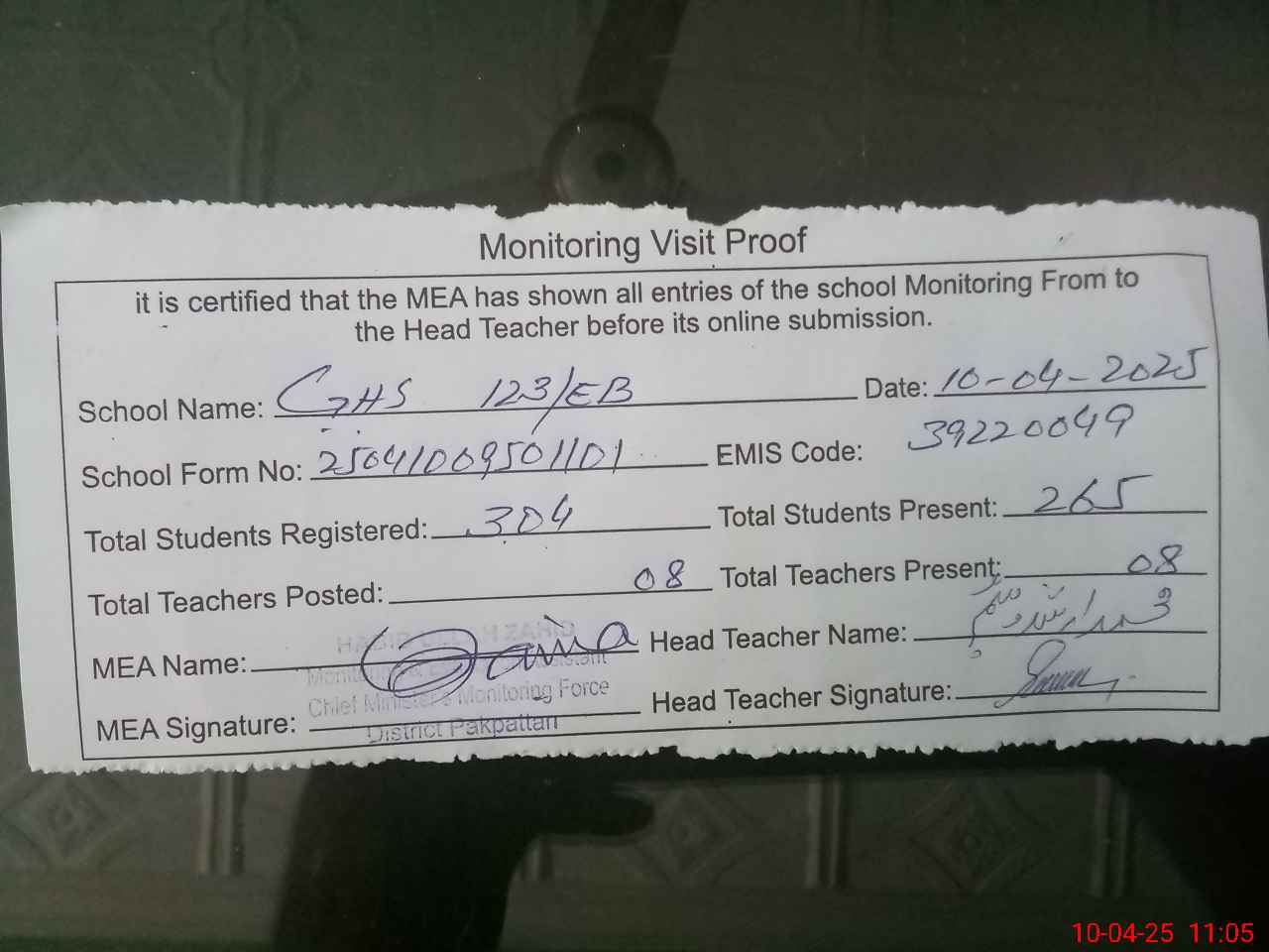 | Attendance Register | Head Teacher | MEA with School | Visit Proof |