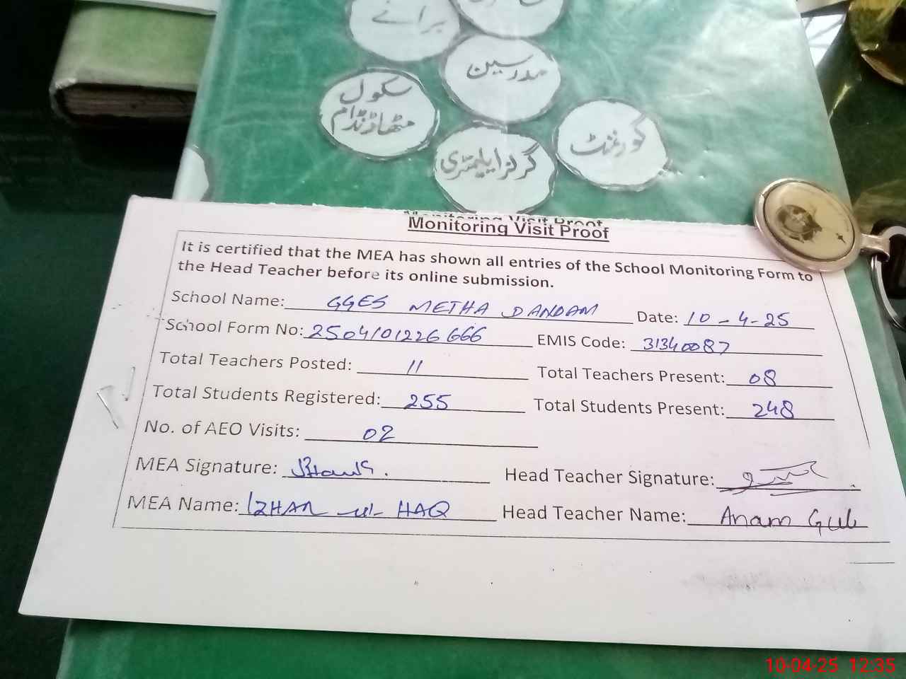 | Certified that this School was Inspected by the Undersigned MEA/DMO Today and the Information Stated Above is as Per Record. | |||||
