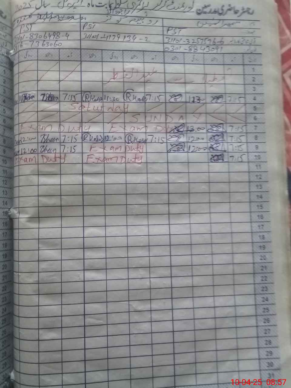 | 31**** | Mu**** Sh**** | PST | Regular | 0 | 0 | 0 | 0 | 0 | 0 | 0 | 0 | 0 | Exam Duty |