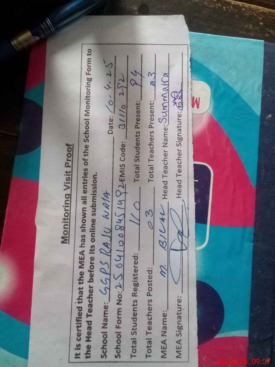 | Attendance Register | Head Teacher | MEA with School | Visit Proof |