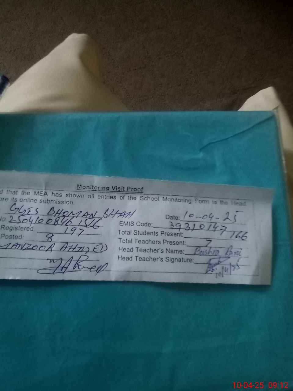 | Attendance Register | Head Teacher | MEA with School | Visit Proof |