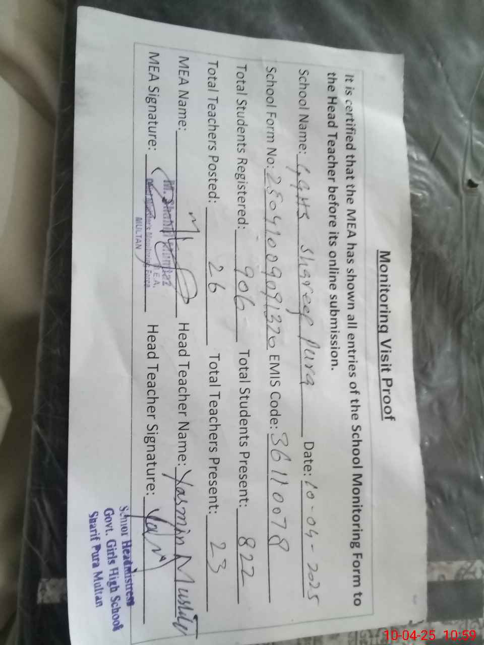 | EMIS Code: 36110078 | Name of School: GGHS SHARIF PURA MULTAN | |||