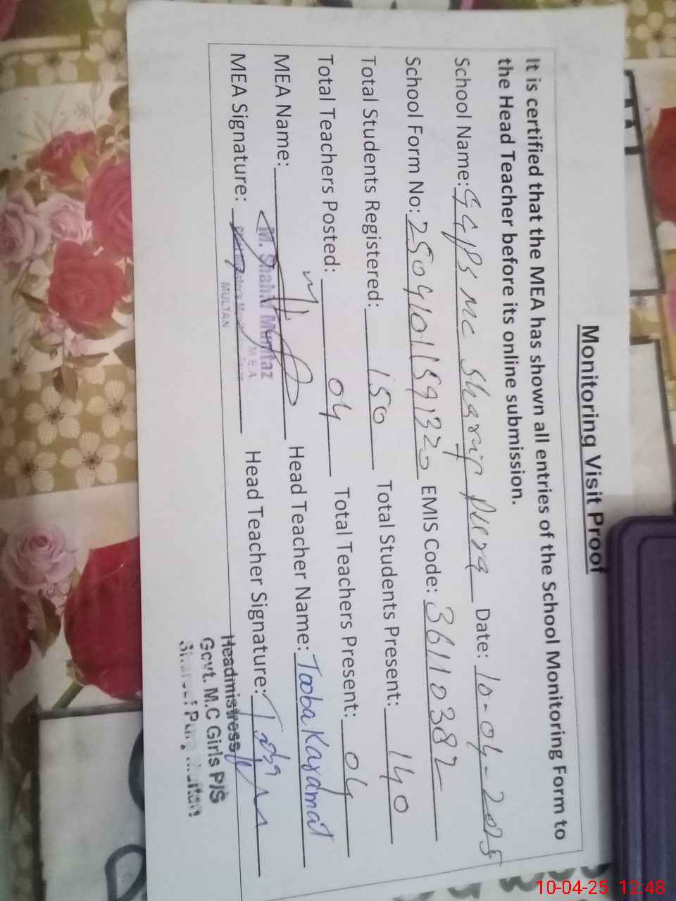 | Certified that this School was Inspected by the Undersigned MEA/DMO Today and the Information Stated Above is as Per Record. | |||||