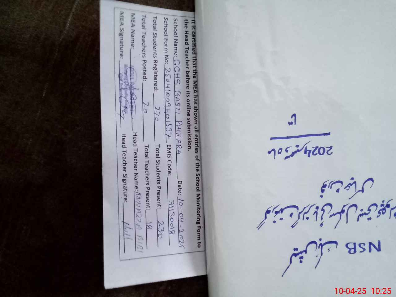 | Certified that this School was Inspected by the Undersigned MEA/DMO Today and the Information Stated Above is as Per Record. | |||||