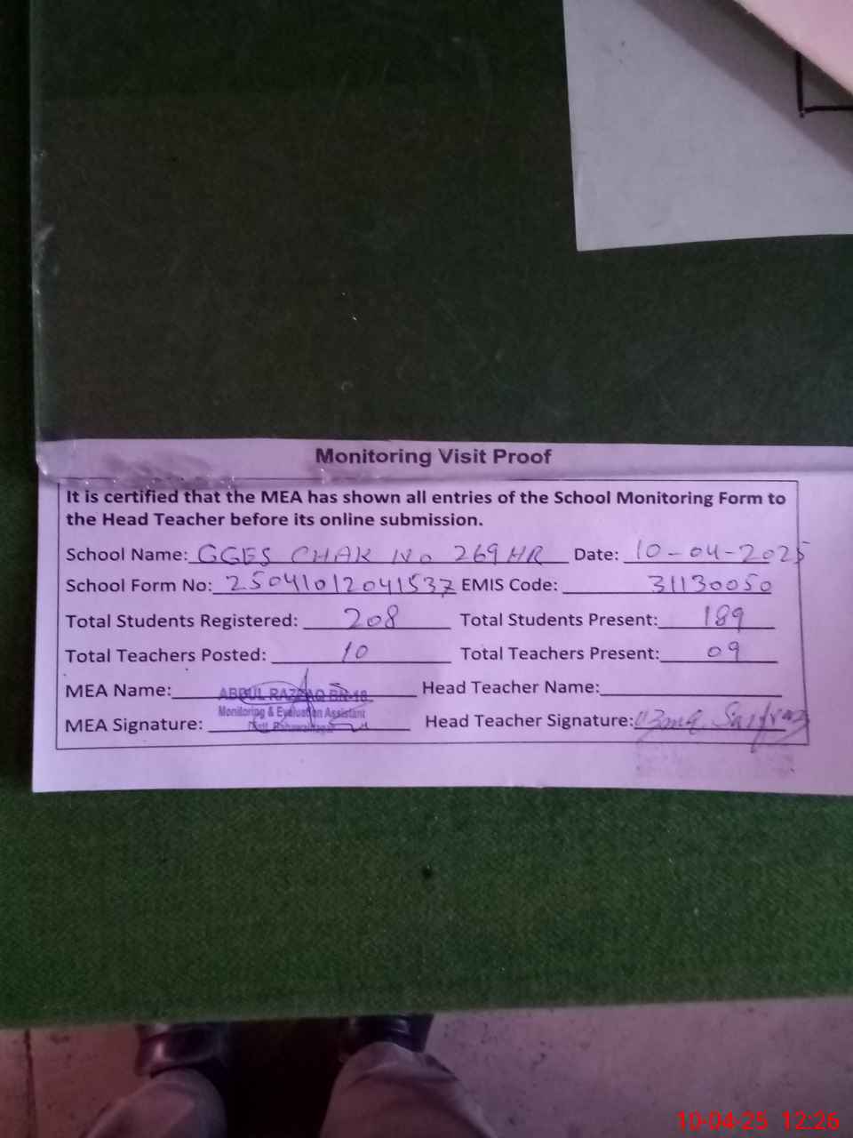 | Attendance Register | Head Teacher | MEA with School | Visit Proof |