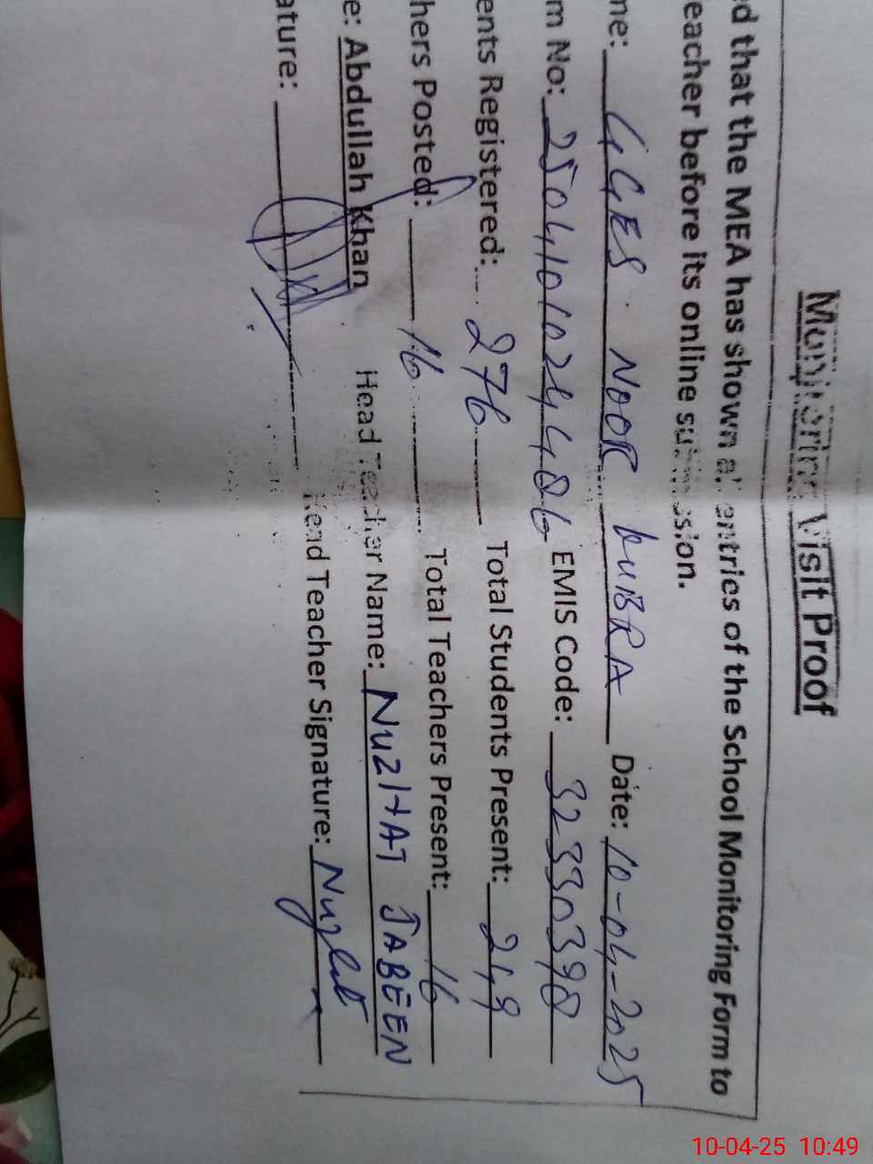 | Certified that this School was Inspected by the Undersigned MEA/DMO Today and the Information Stated Above is as Per Record. | |||||