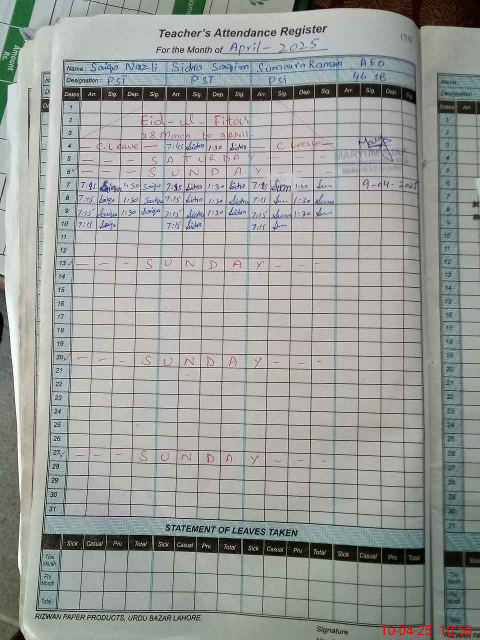 | Leave | Duty | Absent | Maternity | Medical | Ex- Pak |