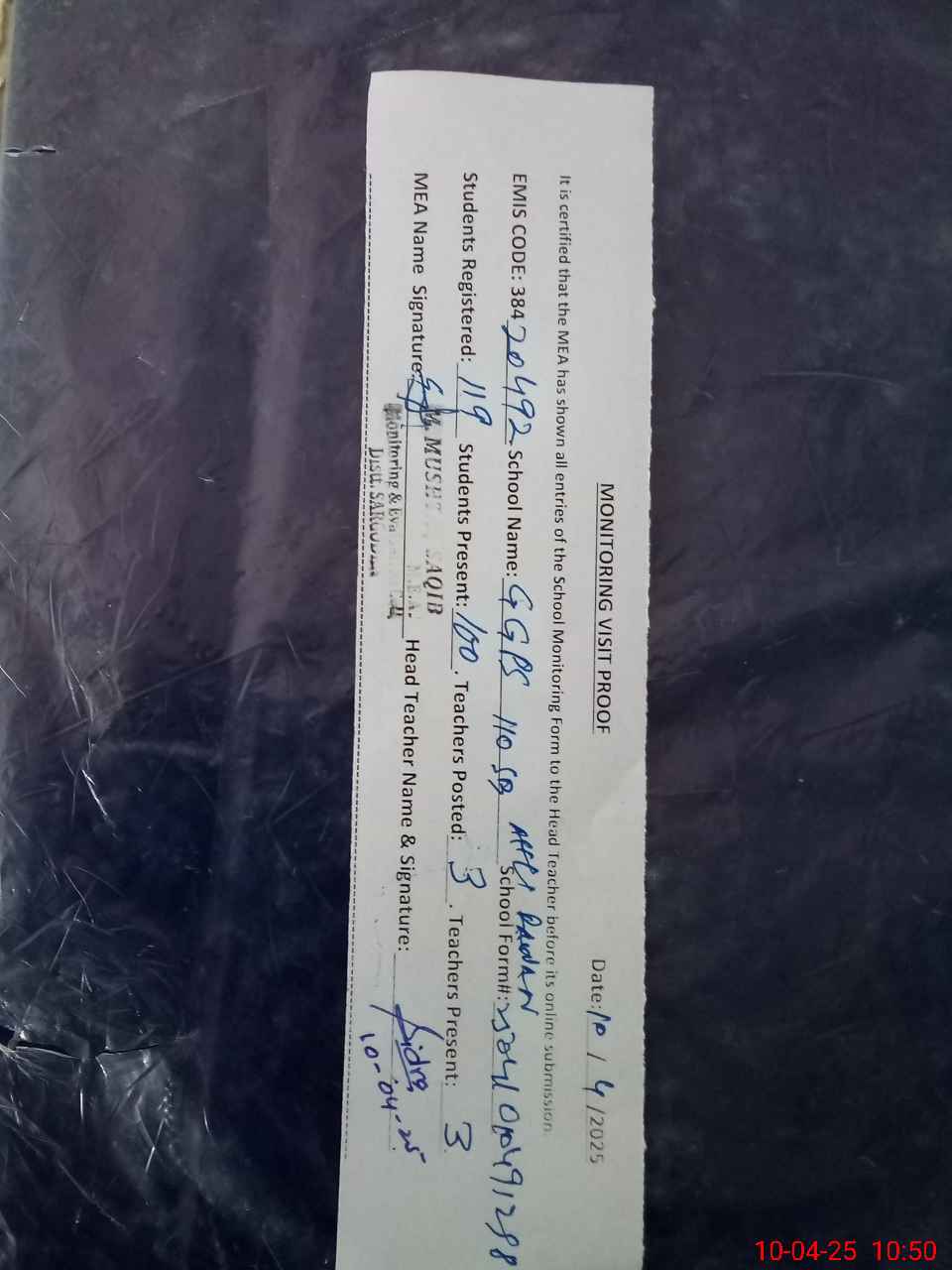 | Attendance Register | Head Teacher | MEA with School | Visit Proof |