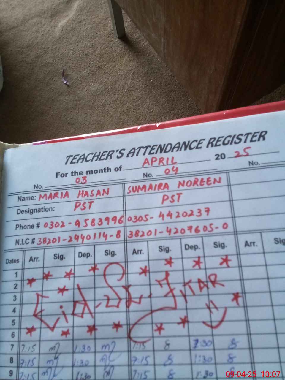 | Name: Ir**** Sh**** Designation: (School Headmaster's/Headmistress's) PST Phone/Cell Number: 03**** |