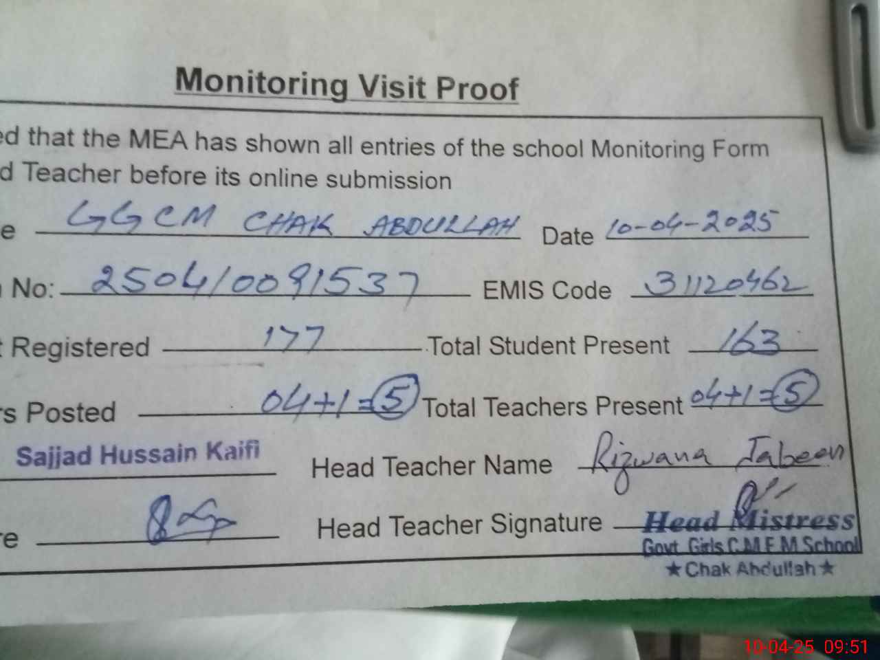 | Attendance Register | Head Teacher | MEA with School | Visit Proof |
