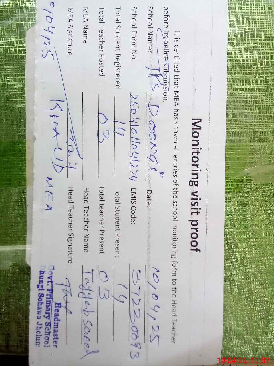 | Attendance Register | Head Teacher | MEA with School | Visit Proof |