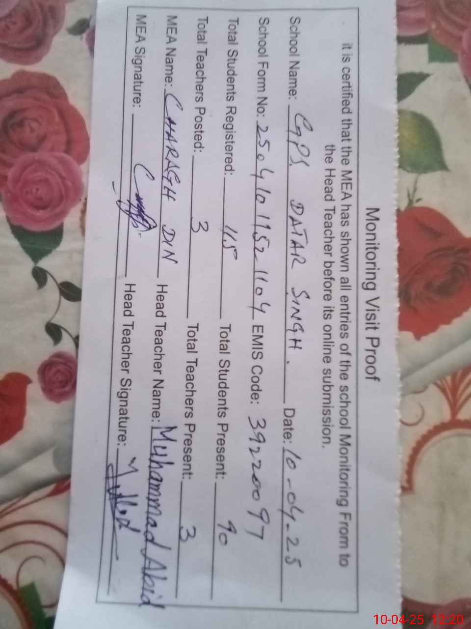 | EMIS Code: 39220097 | Name of School: GPS DATAR SINGH | |||