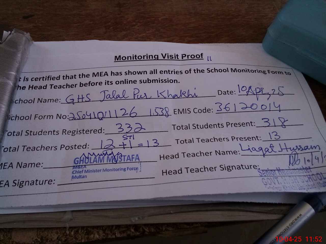 | Attendance Register | Head Teacher | MEA with School | Visit Proof |