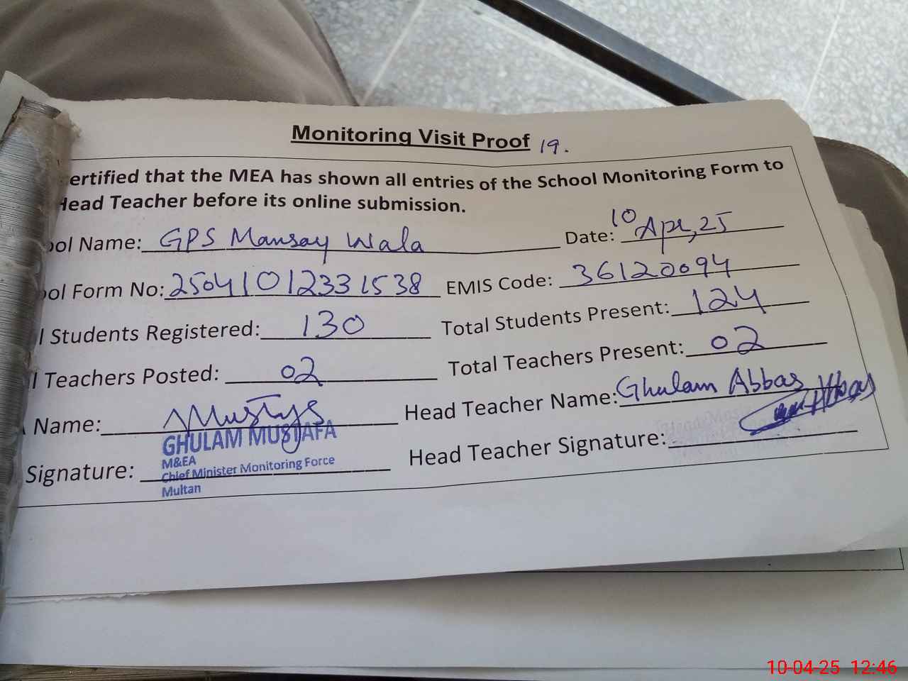| Monitoring Date: 10-04-2025 | Start Time: 10-04-2025 12:33 PM | End Time: 10-04-2025 12:47 PM | Name of MEA: Gh**** Mu**** | |