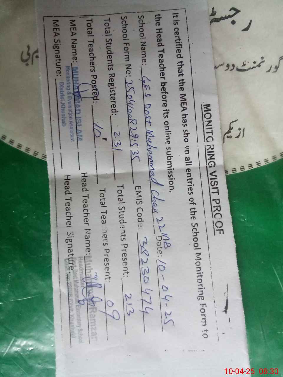 | EMIS Code: 38230474 | Name of School: GES DOST MUHAMMAD CHAK NO. 22 MB | |||