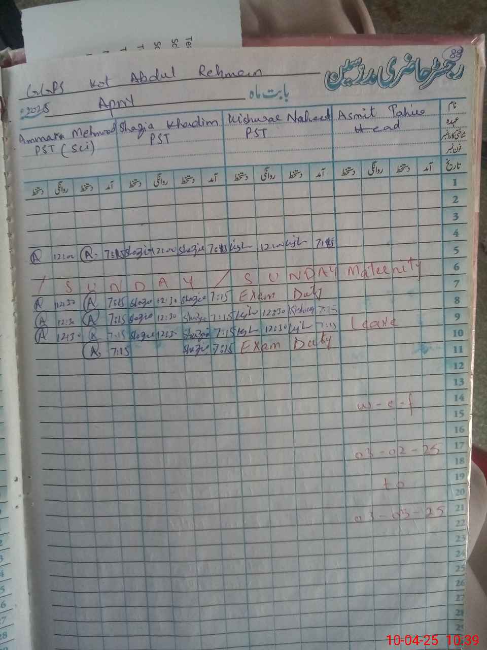 | 35**** | Fa**** Ja**** | PST | Regular | 0 | 0 | 0 | 0 | 0 | 0 | 0 | 0 | 0 | Exam Duty |