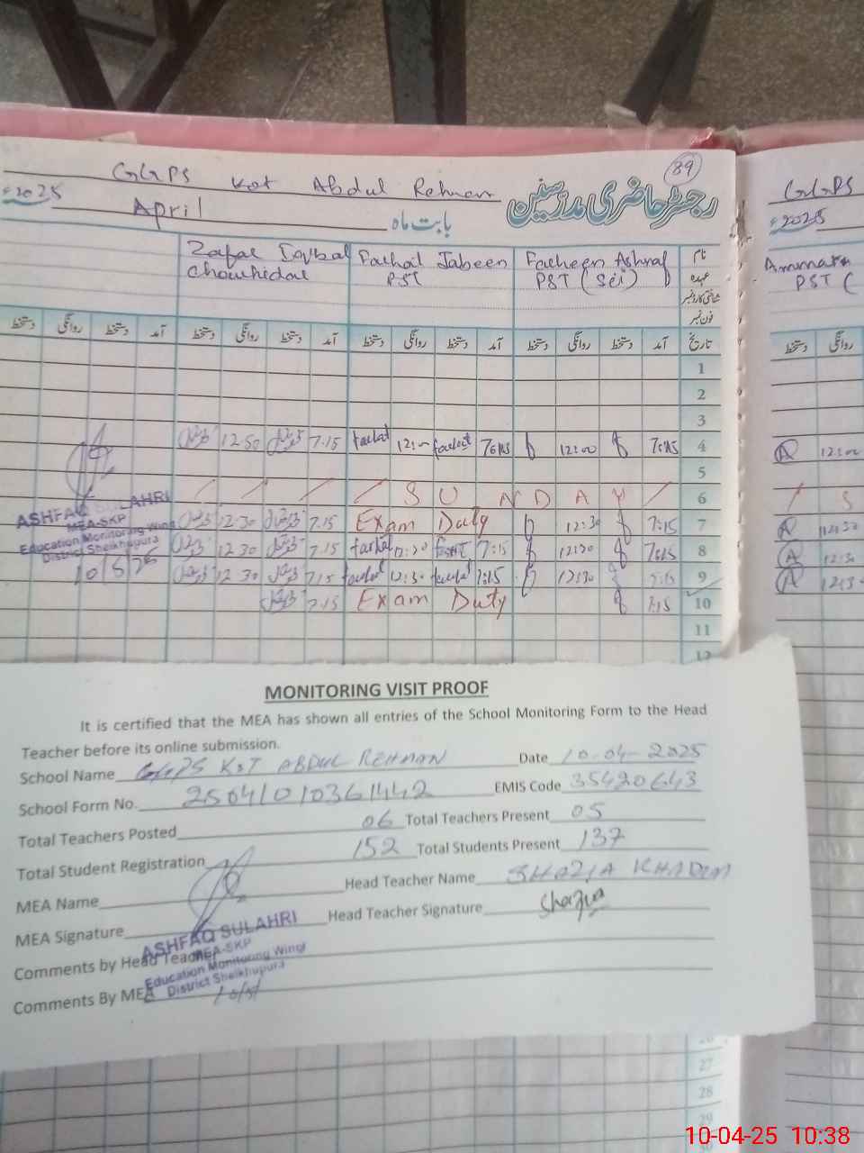 | Attendance Register | Head Teacher | MEA with School | Visit Proof |