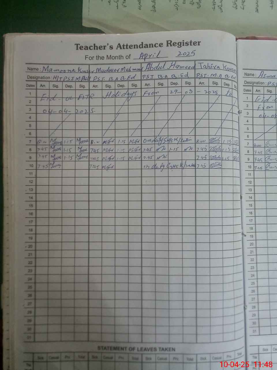 | 37**** | Ab**** Ha**** | PST | Regular | 0 | 0 | 0 | 0 | 0 | 0 | 0 | 0 | 0 | Exam Duty |