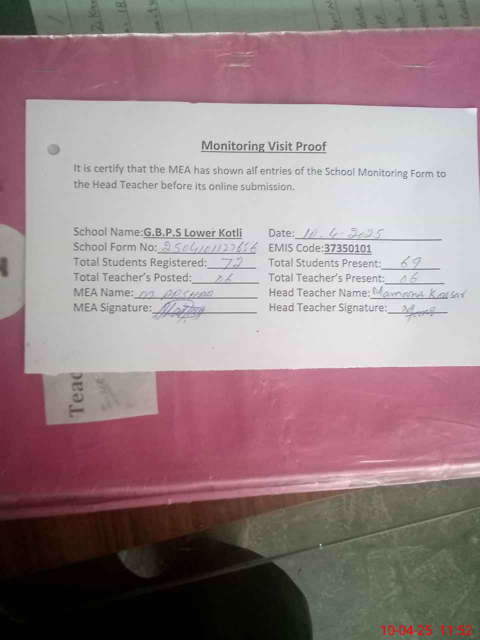 | Attendance Register | Head Teacher | MEA with School | Visit Proof |
