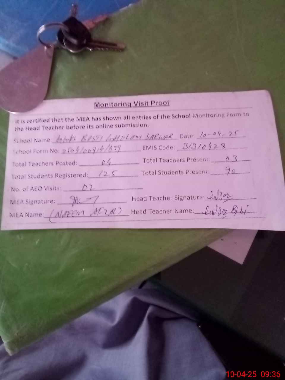 | Monitoring Date: 10-04-2025 | Start Time: 10-04-2025 08:54 AM | End Time: 10-04-2025 09:36 AM | Name of MEA: Na**** Af**** | |